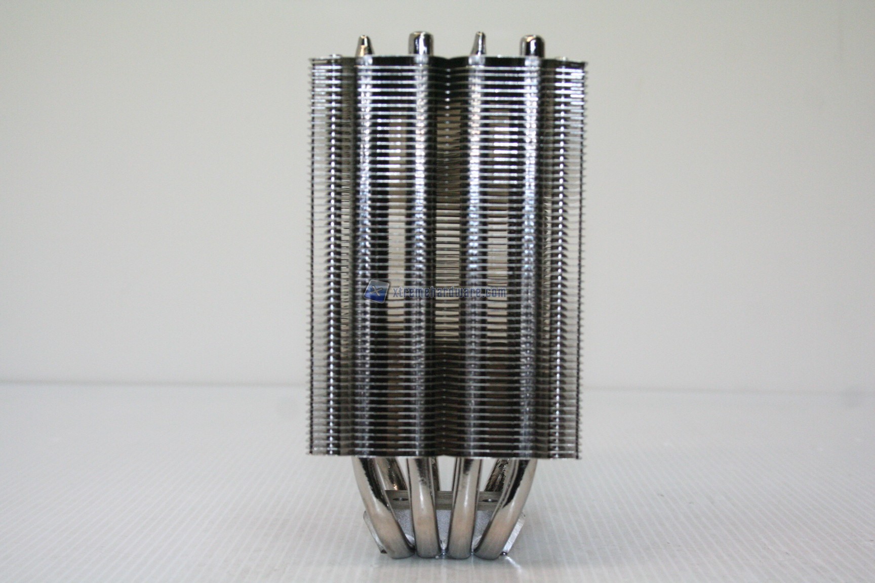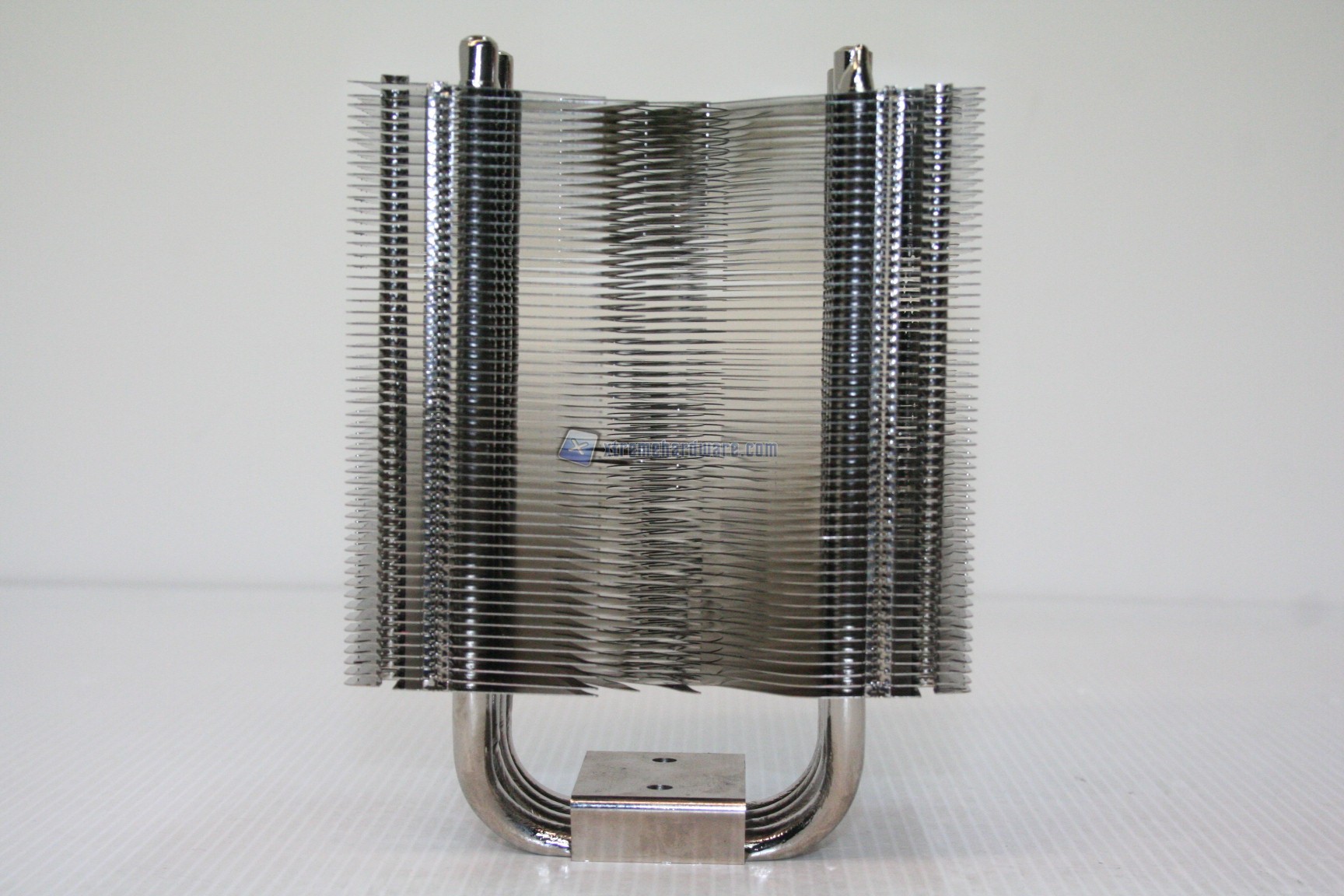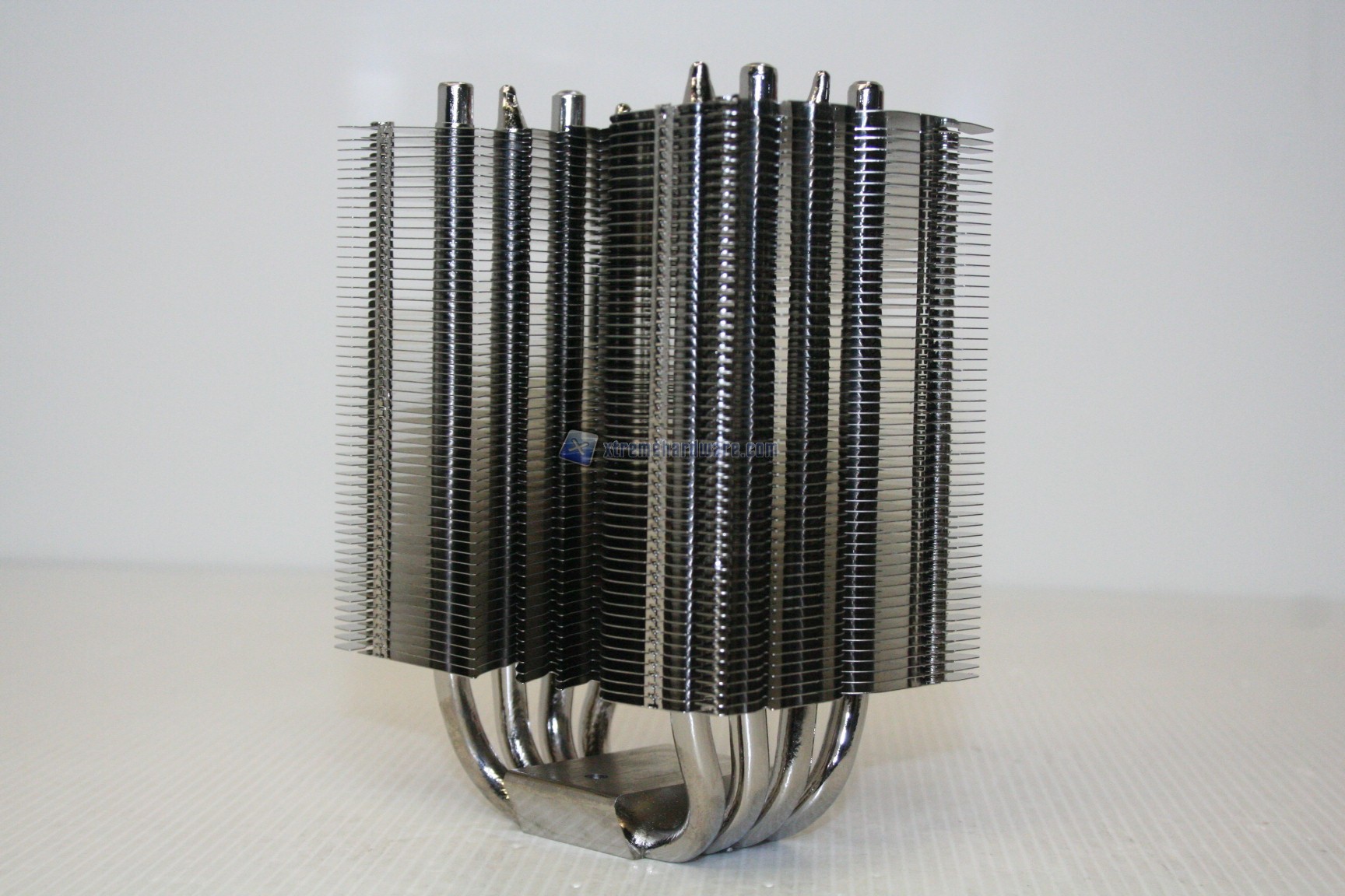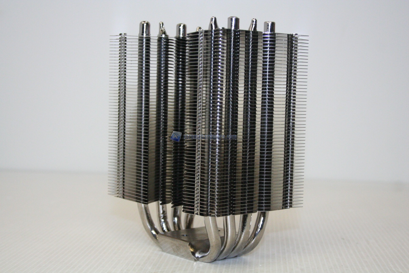 La scudatura finale delle heatpipes è egualmente valida e presenta una configurazione stock Push, anche se purtroppo non è possibile aggiungerne una seconda posteriormente, per via dell’assenza dei fermi nel bundle, similmente al Themis. E’ un modello orientato a gestire una CPU con frequenze medio-alte, con overclock moderati qualora si volesse mantenere una buona silenziosità, ma anche overclock elevati accontentandosi di una soluzione più rumorosa. La superficie dissipante comincia ad essere importante e quindi non ci saranno problemi per la gestione di CPU potenti, con TDP nell’ordine dei 130/160W.