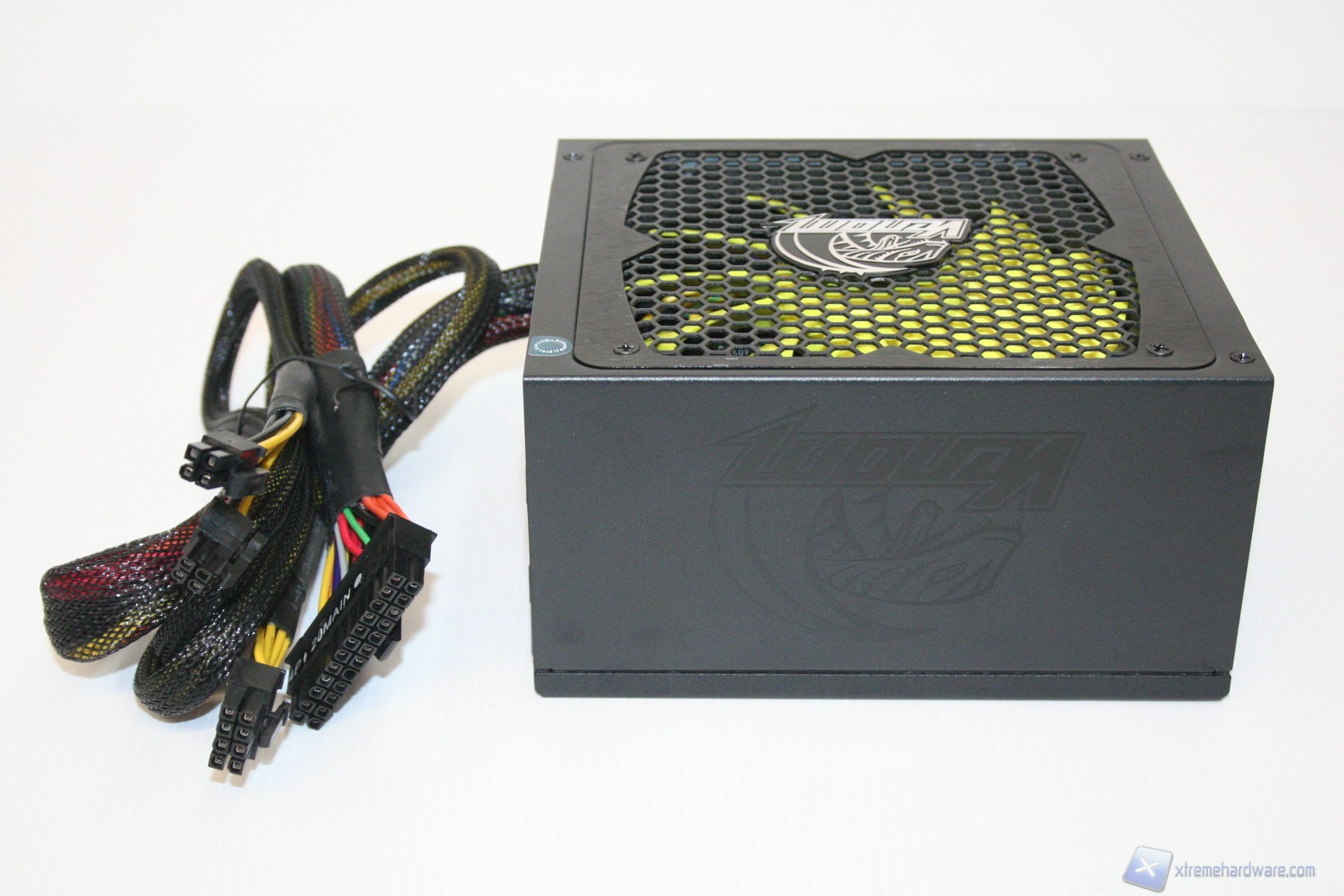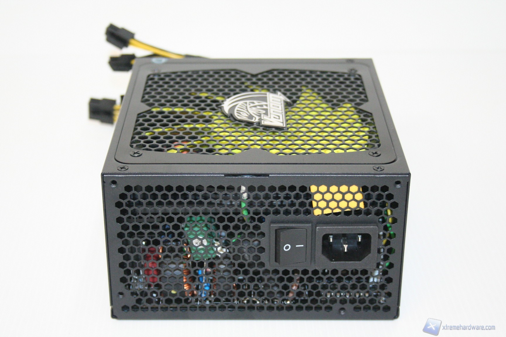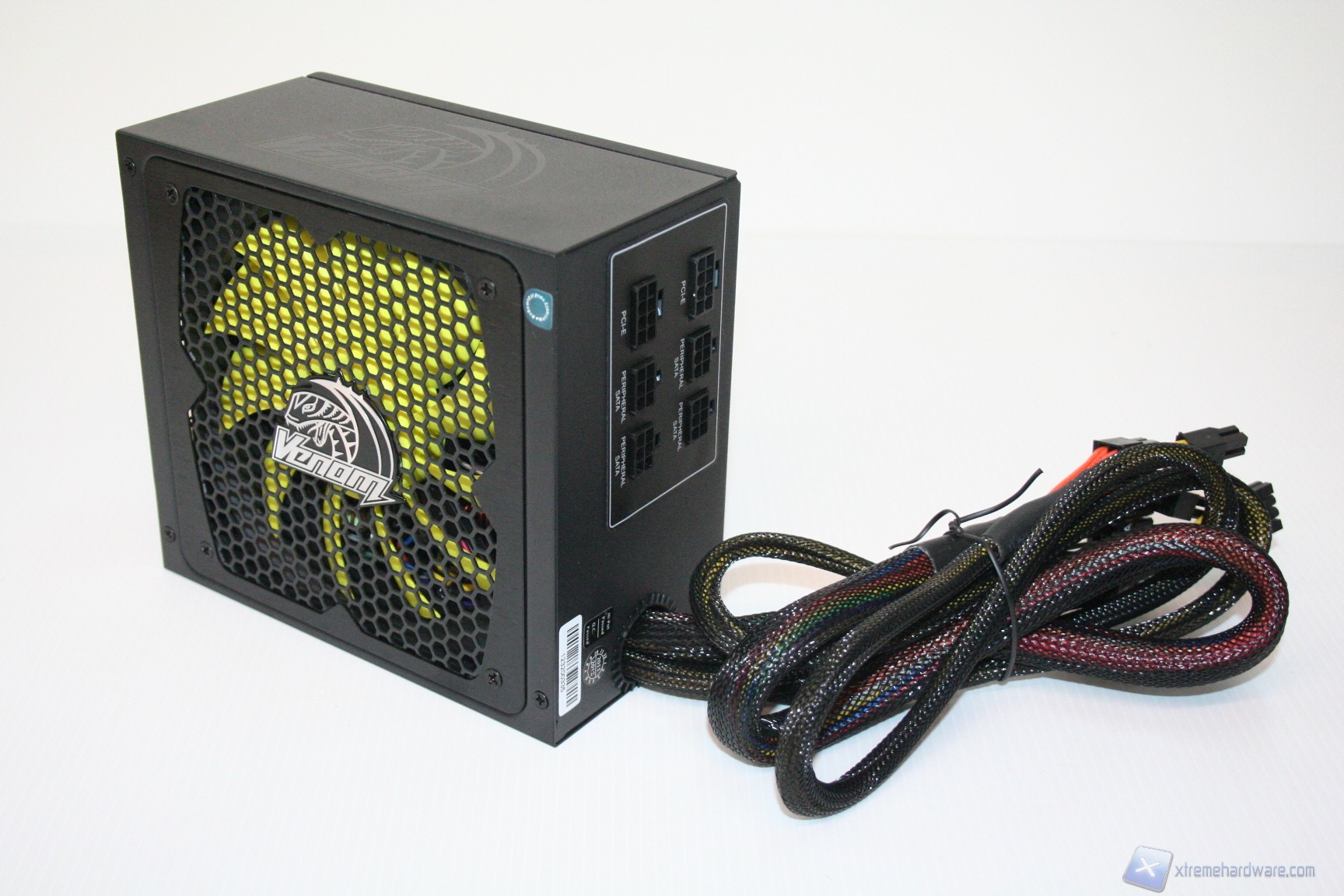 Il design esterno è molto aggressivo, ricercato e curato, infatti si nota immediatamente che si è cercato di dare un tocco in più anche allo chassis esterno. E’ notevole ad esempio il bordo esterno della ventola, avente una finitura in alluminio spazzolato, come è notevole il logo Venom sito al centro della griglia di protezione della ventola. Similmente ai prodotti recensiti da noi fino ad oggi, Akasa mantiene lo stesso stile, creando quindi una linea di prodotti che abbia le medesime caratteristiche estetiche. Adotta una colorazione grigio scura e si presenta con un’unità parzialmente modulare. La ventola, dotata di griglia superiore, presenta un diametro di 135mm, mentre nella parte anteriore sono posizionate le uscite modulari dell’unità, assieme ai cavi non removibili di alimentazione da 24, 8 PIN e 4+4 della scheda madre e CPU. Oltre a questo presenta il logo Venom nella parte laterale sinistra, ed uno sticker superiore, che facilita la lettura delle specifiche all’interno del cabinet. La verniciatura è di buona fattura e non sono presenti sbavature od imperfezioni.